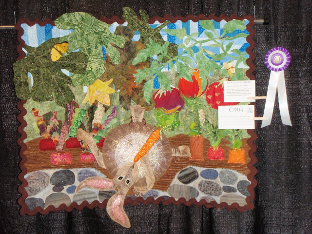 Lastly, "The Best Things in Life are Free" won the award for Most Whimsical Quilt at the 2012 Vermont Quilt Festival. Janet Cohen and Linda Vizi from Moorestown, NJ wrote this about their fun quilt, "This original design was inspired by a continual vigil to keep our crops safe from local rabbits who believe in the motto 'The Best Things in Life are Free'".